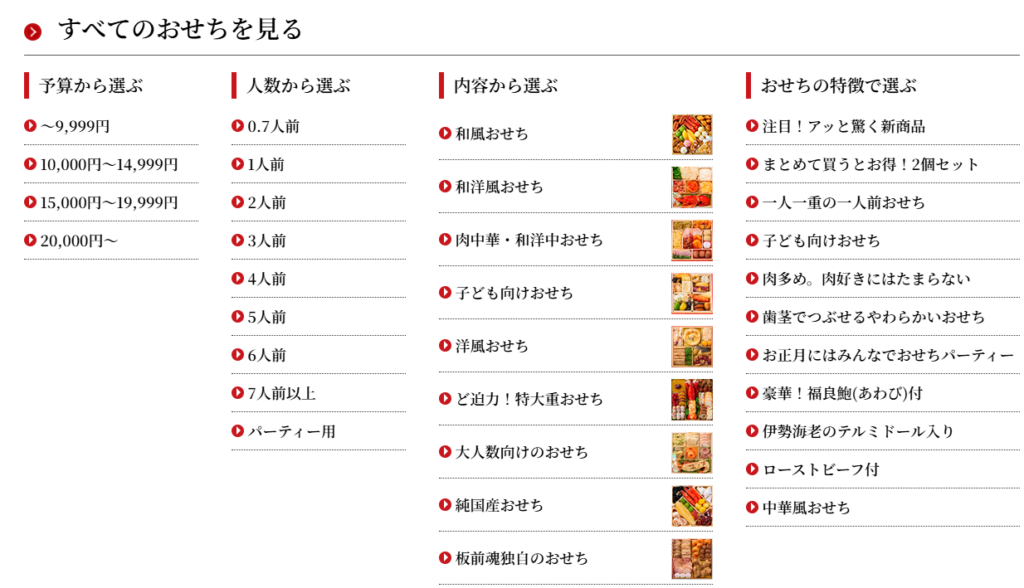 - 定番のおせちから変わり種まで、幅広いおせちの中から選びたい